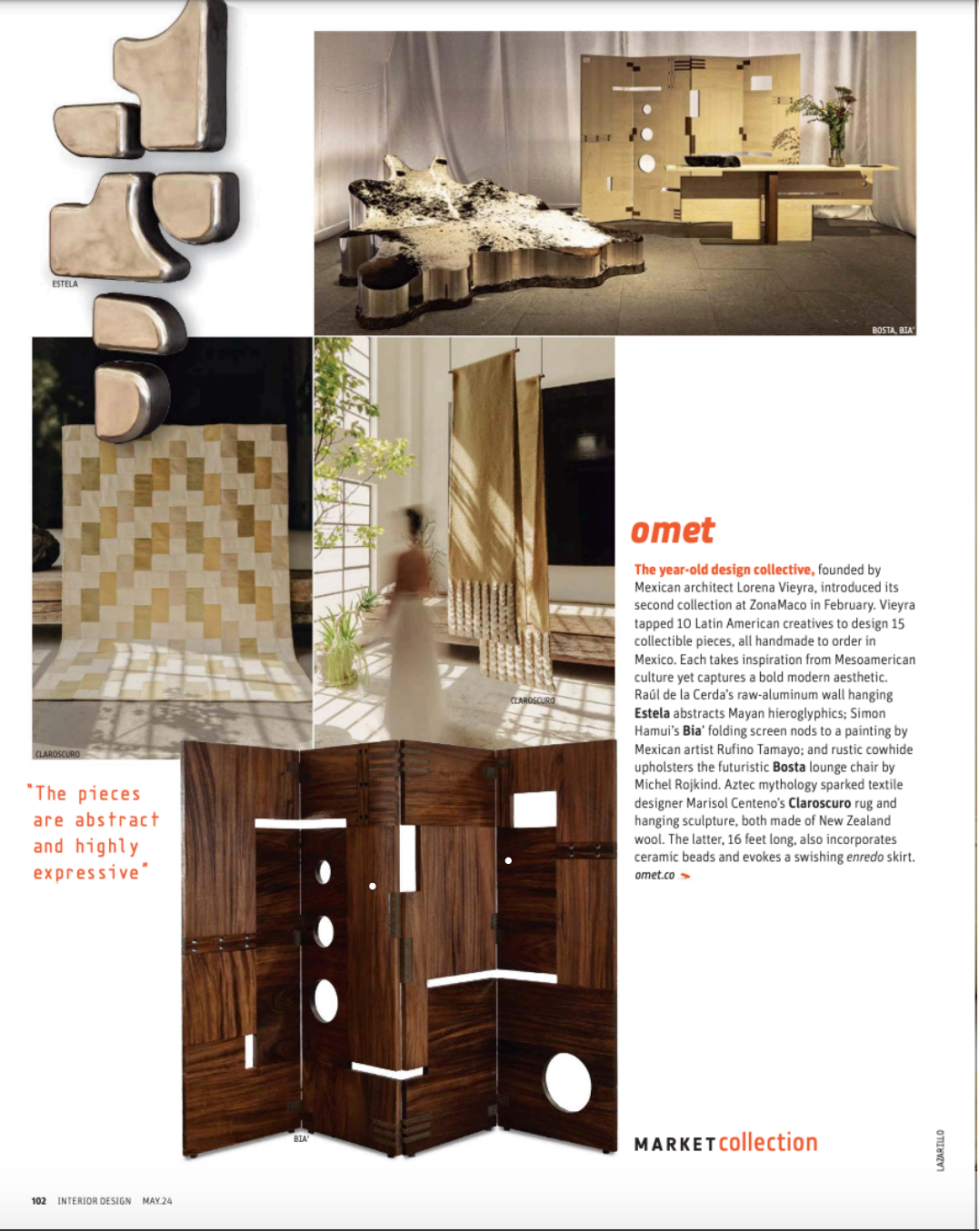"Omet, the year-old design collective, founded by Mexican architect Lorena Vieyra, introduced its second collection at ZonaMaco in February. Vieyra tapped 10 Latin American creatives to design 15 collectible pieces, all handmade to order in Mexico. Each takes inspiration from Mesoamerican culture yet captures a bold modern aesthetic. Raúl de la Cerda’s raw-aluminum wall hanging Estela abstracts Mayan hieroglyphics; Simon Hamui’s Bia’ folding screen nods to a painting by Mexican artist Rufino Tamayo; and rustic cowhide upholsters the futuristic Bosta lounge chair by Michel Rojkind..."