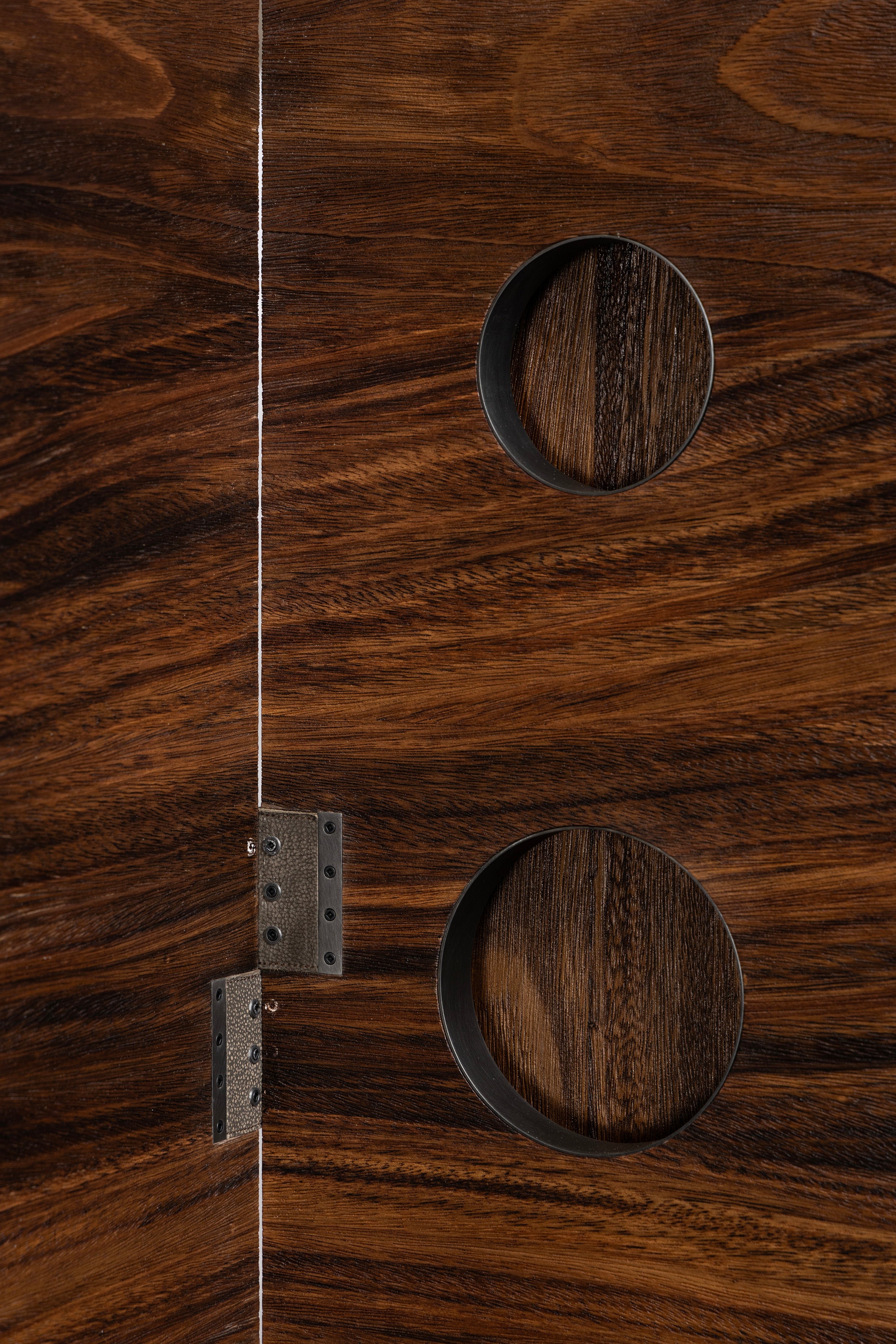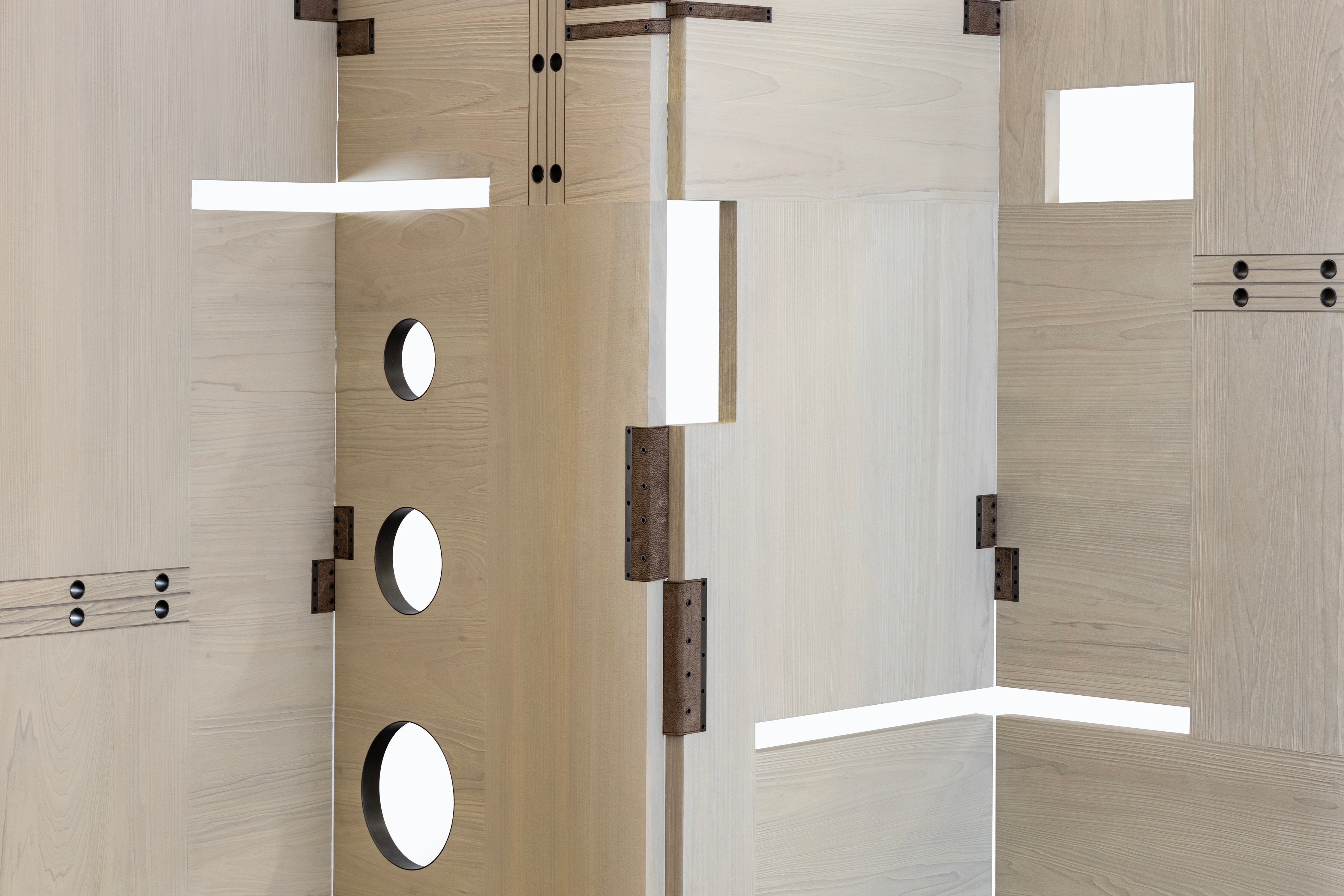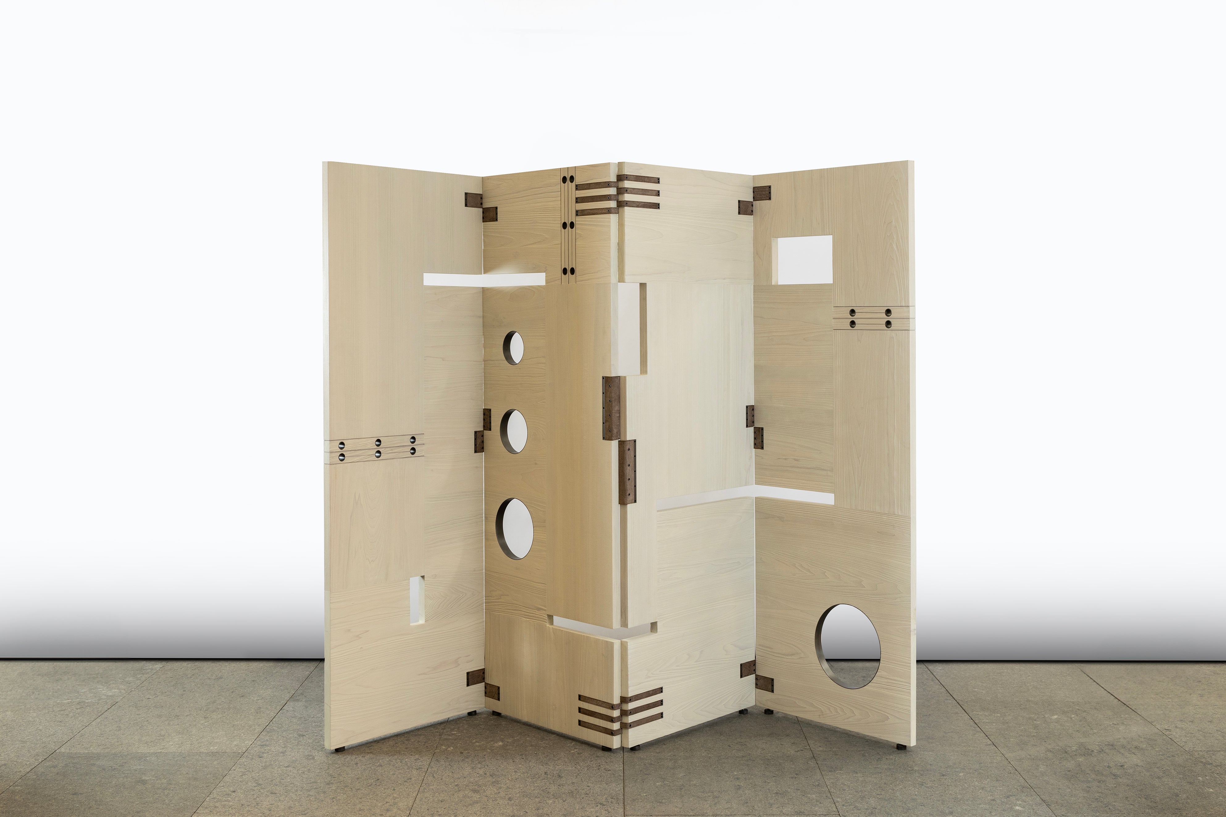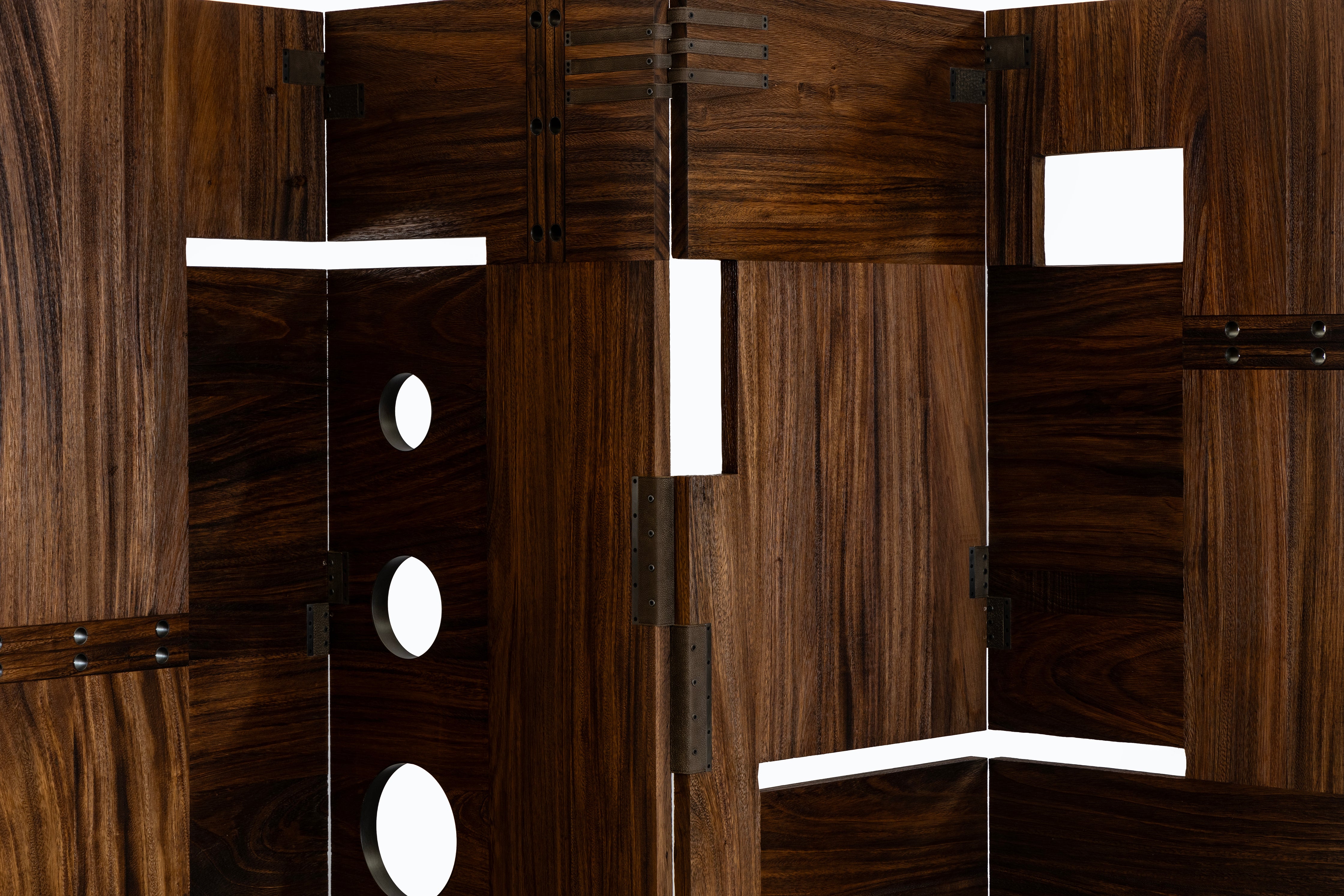Bia’ whose name means "similar" or "equal to" in Zapotec is presented in two color variations that allude to Tamayo's iconic painting "Dos Caras." The piece is meticulously shaped in solid wood using a sandblasting technique and metal inlays with geometric incisions that distinguish it. The four panels are connected by the use of leather hinges that pose a reinterpretation of the traditional metal hinge and create juxtaposition with the grain of the wood. Each Bia’ is meticulously crafted by hand in Simon Hamui's studio workshop.