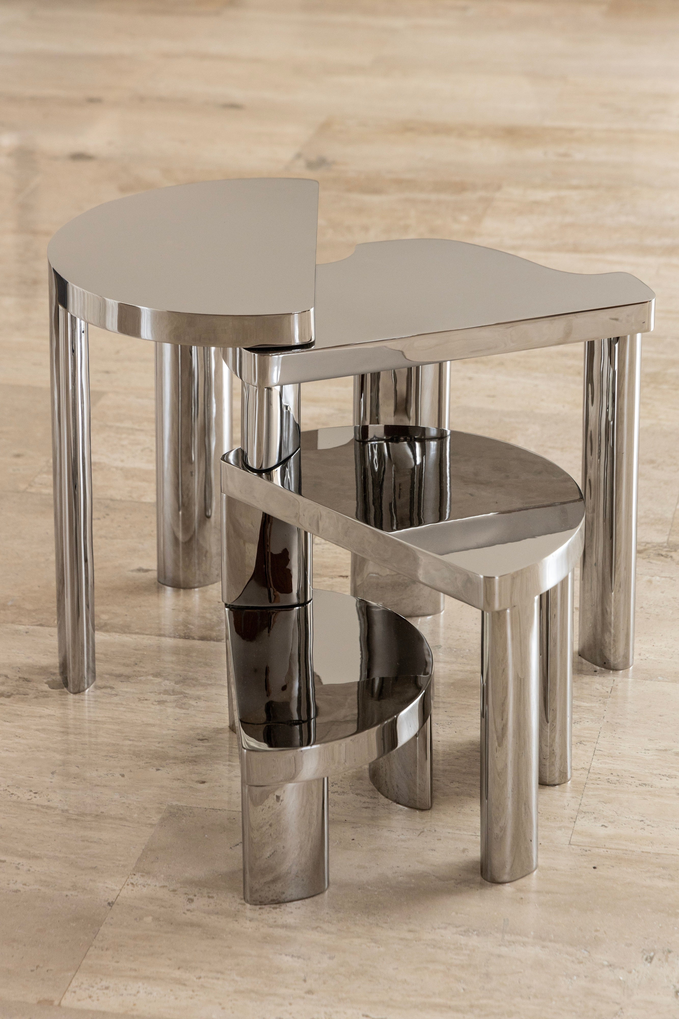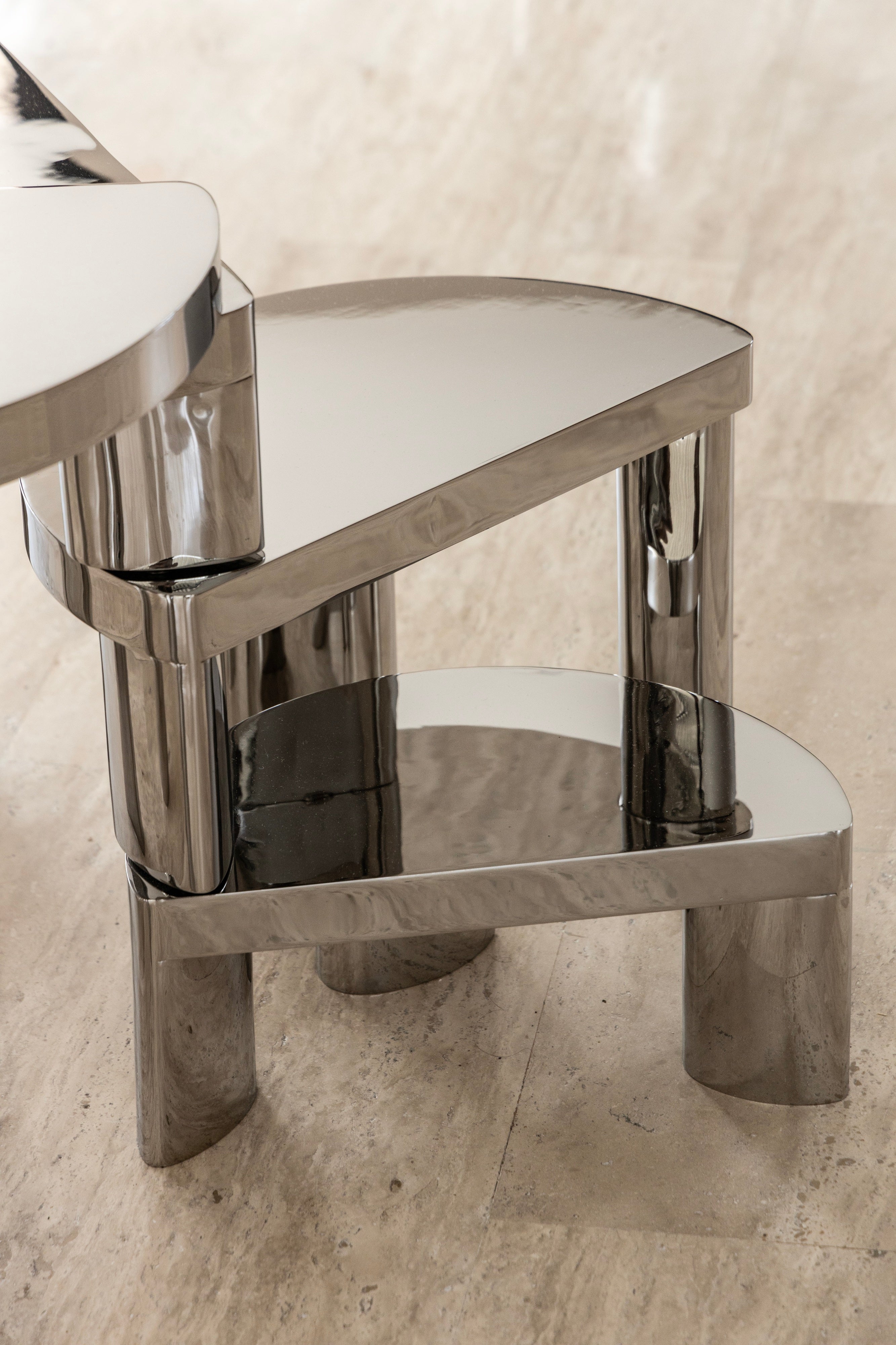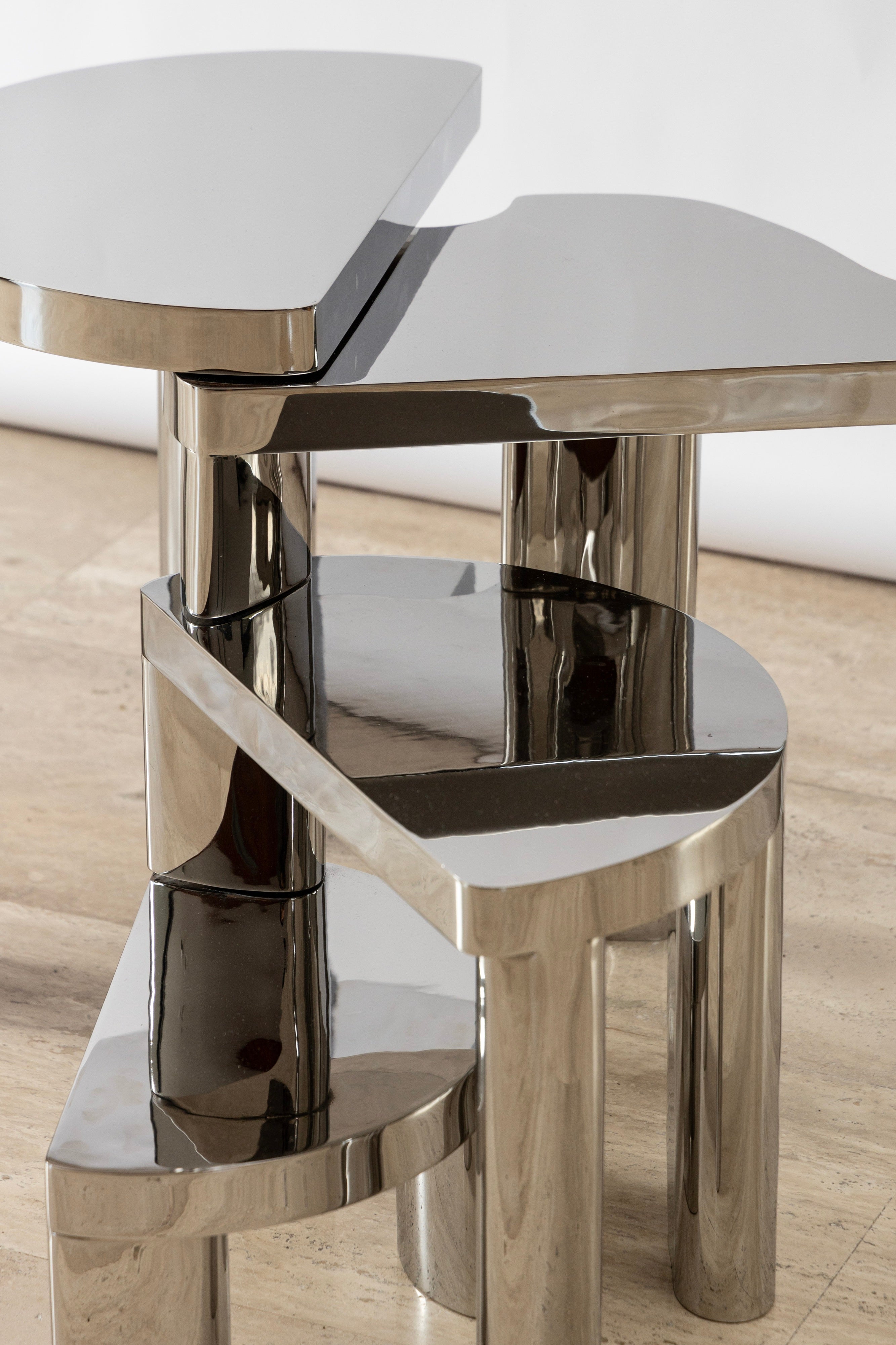 Cascada is a stainless steel piece that unfolds to transform from a table into a bench, shelves, or even a small staircase. Its different levels create a sequence that accompanies the user’s movements and allows for multiple forms of use. Its metallic surface enhances its shifting character, as reflections create a dynamic interplay, capturing light and shadow to emphasize a sense of movement. The piece is perceived as a system that articulates actions, objects, and space.