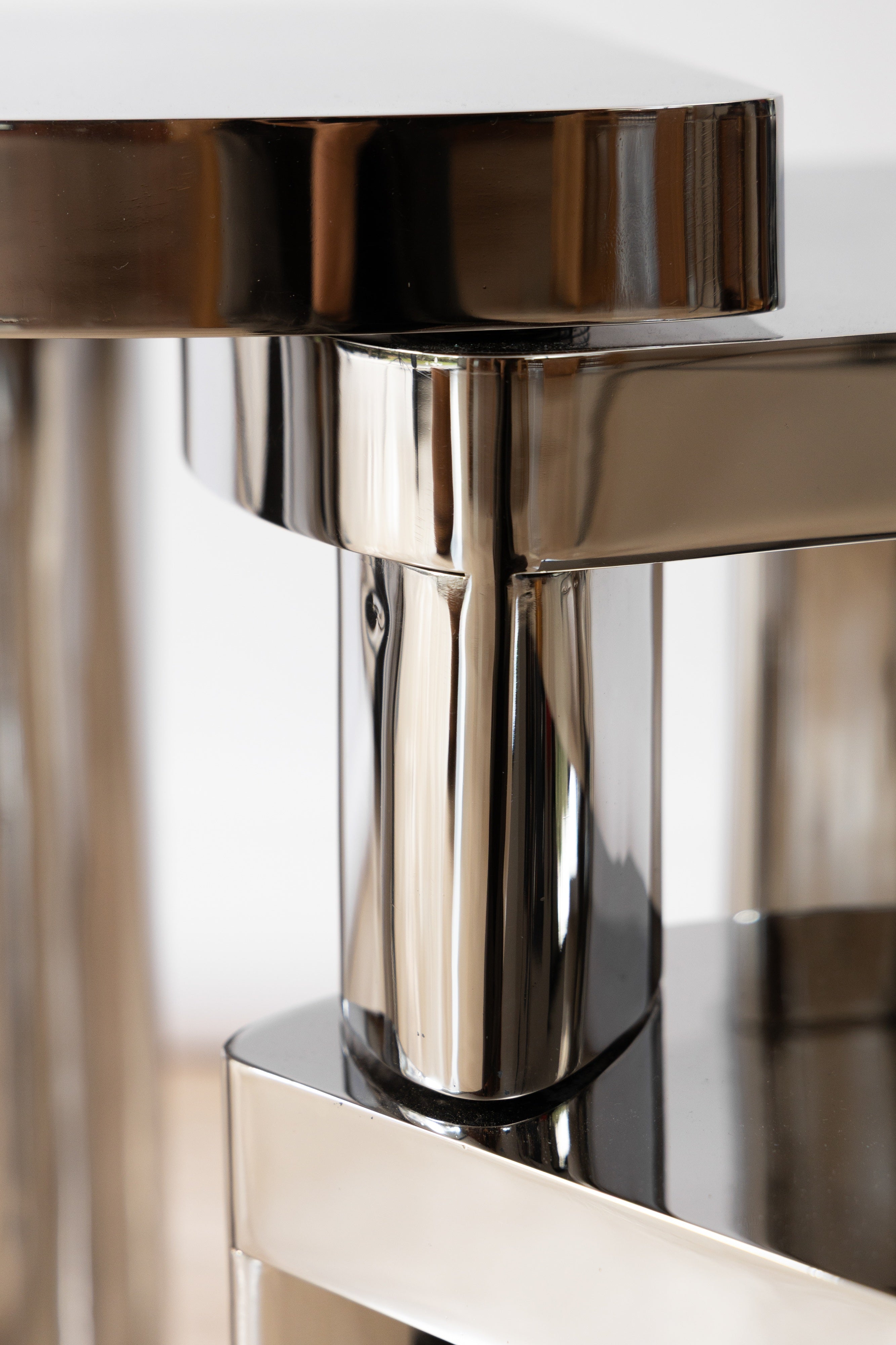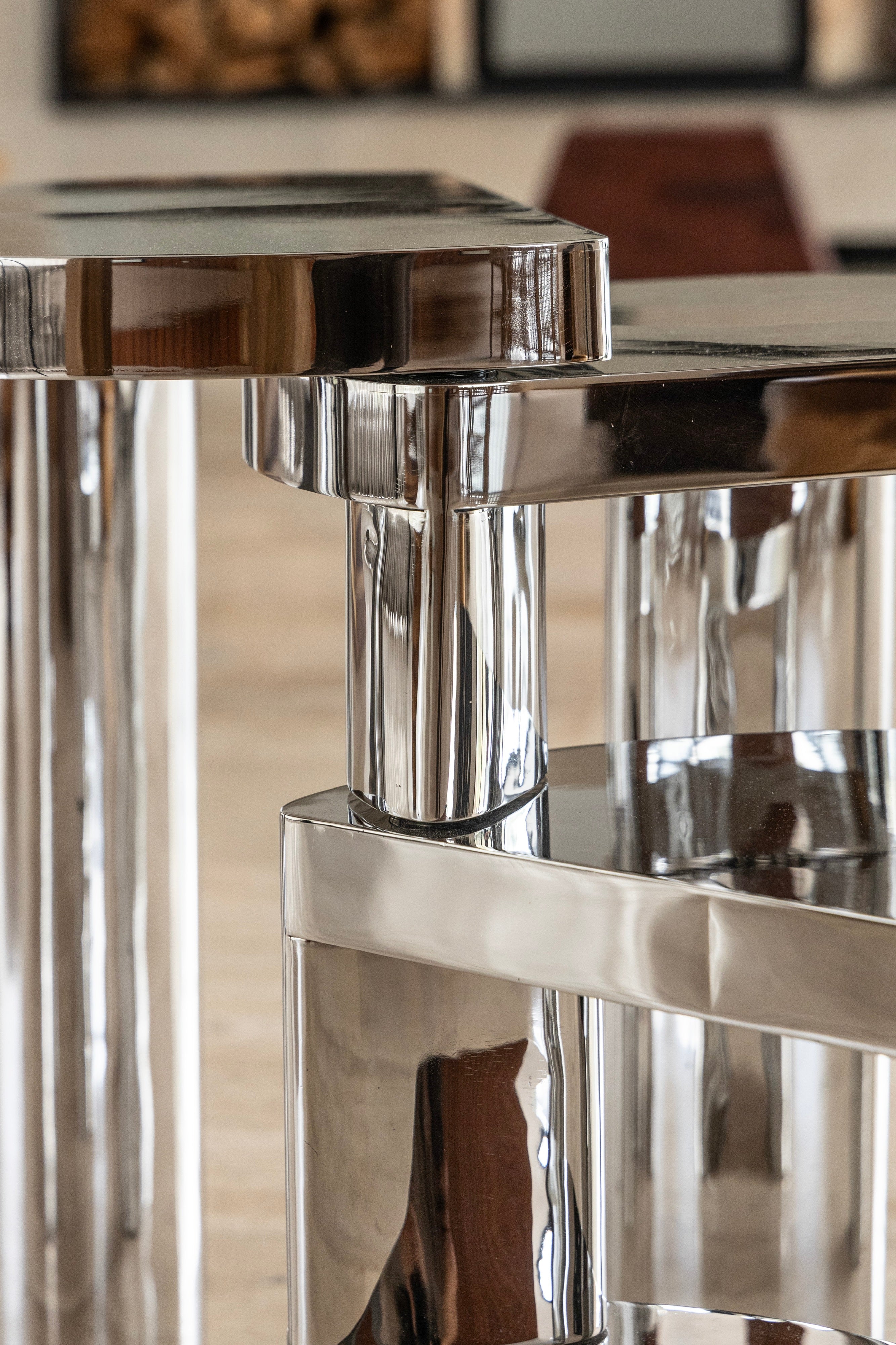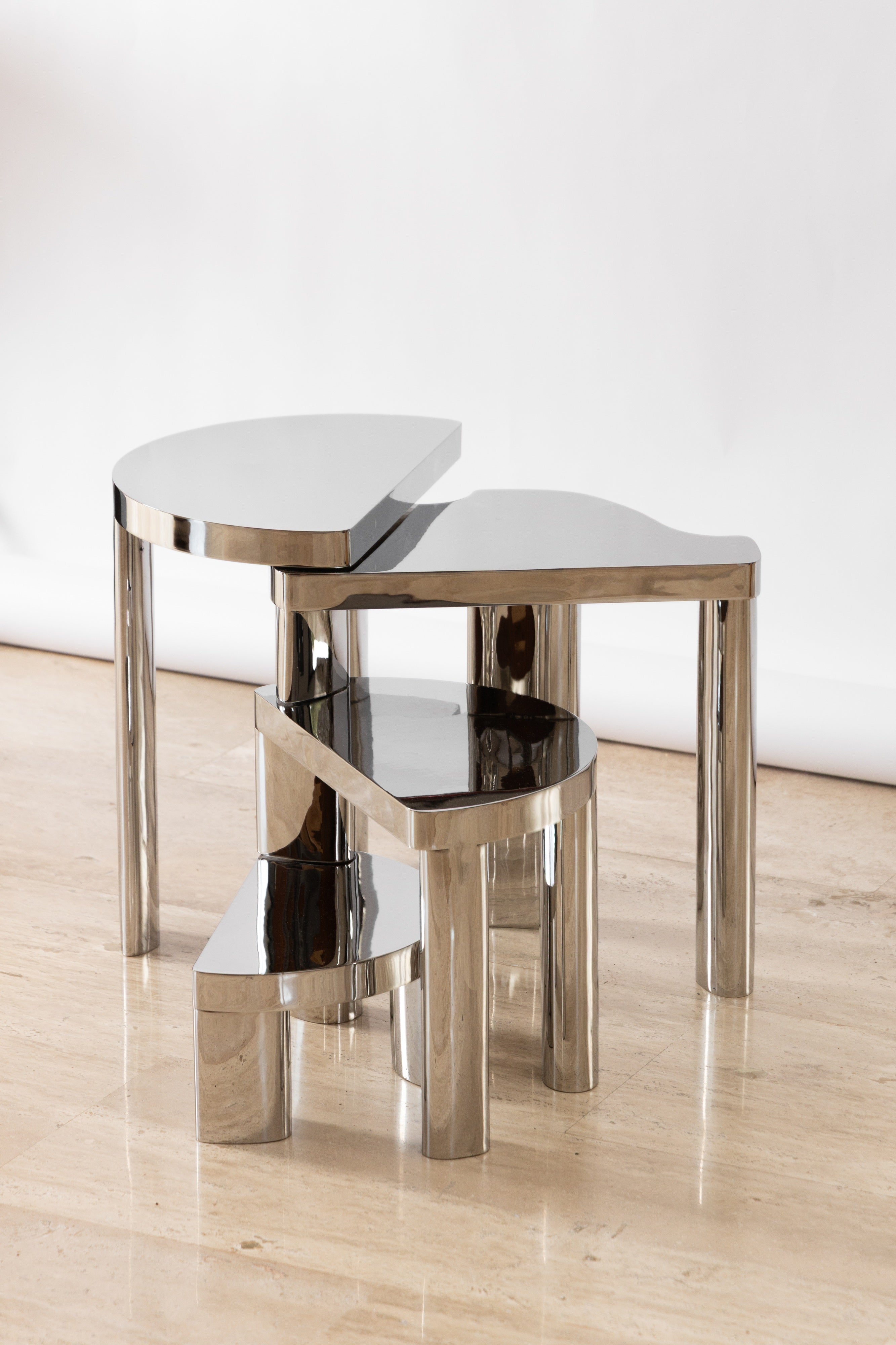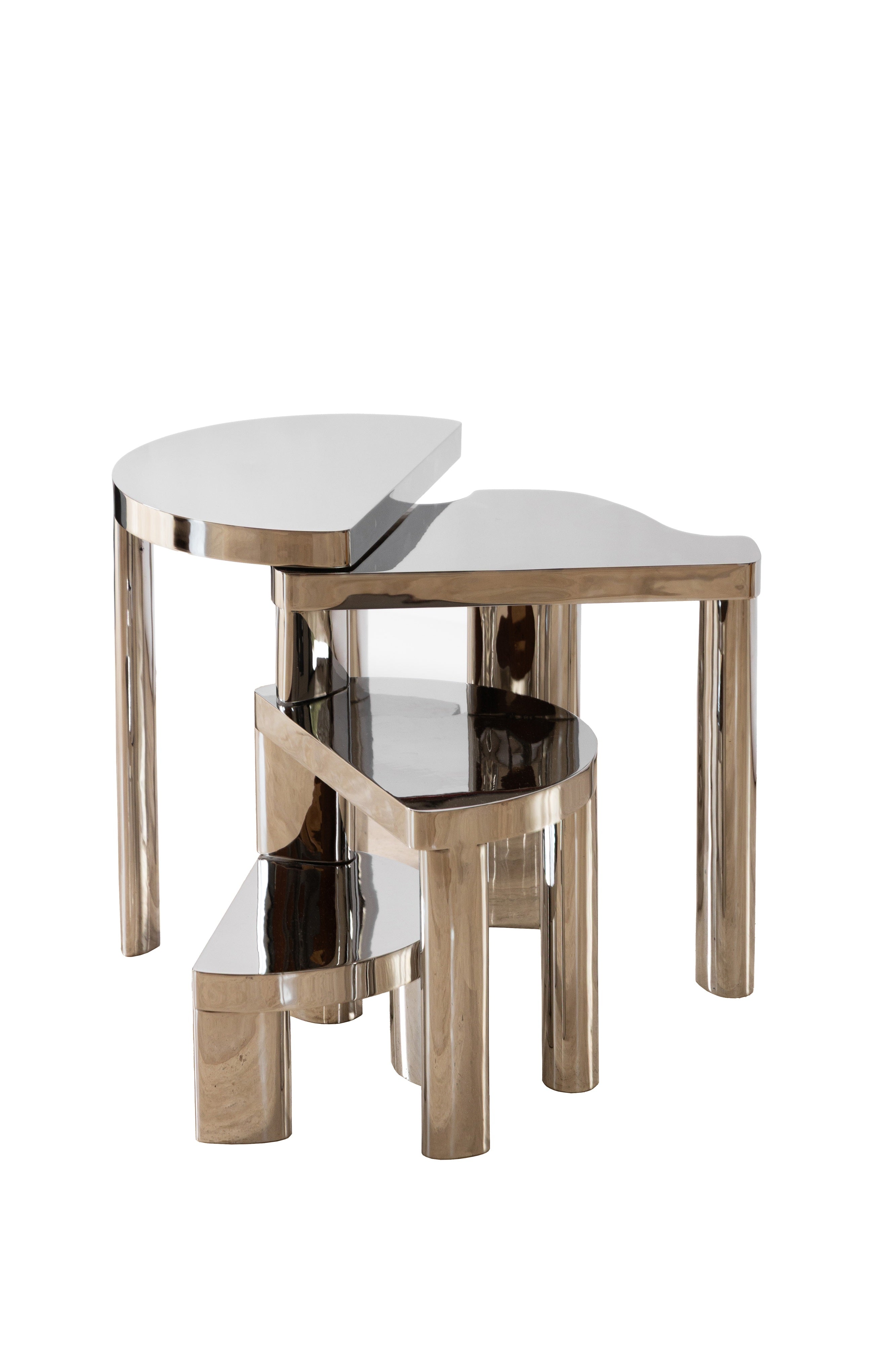 Cascada is a stainless steel piece that unfolds to transform from a table into a bench, shelves, or even a small staircase. Its different levels create a sequence that accompanies the user’s movements and allows for multiple forms of use. Its metallic surface enhances its shifting character, as reflections create a dynamic interplay, capturing light and shadow to emphasize a sense of movement. The piece is perceived as a system that articulates actions, objects, and space.
