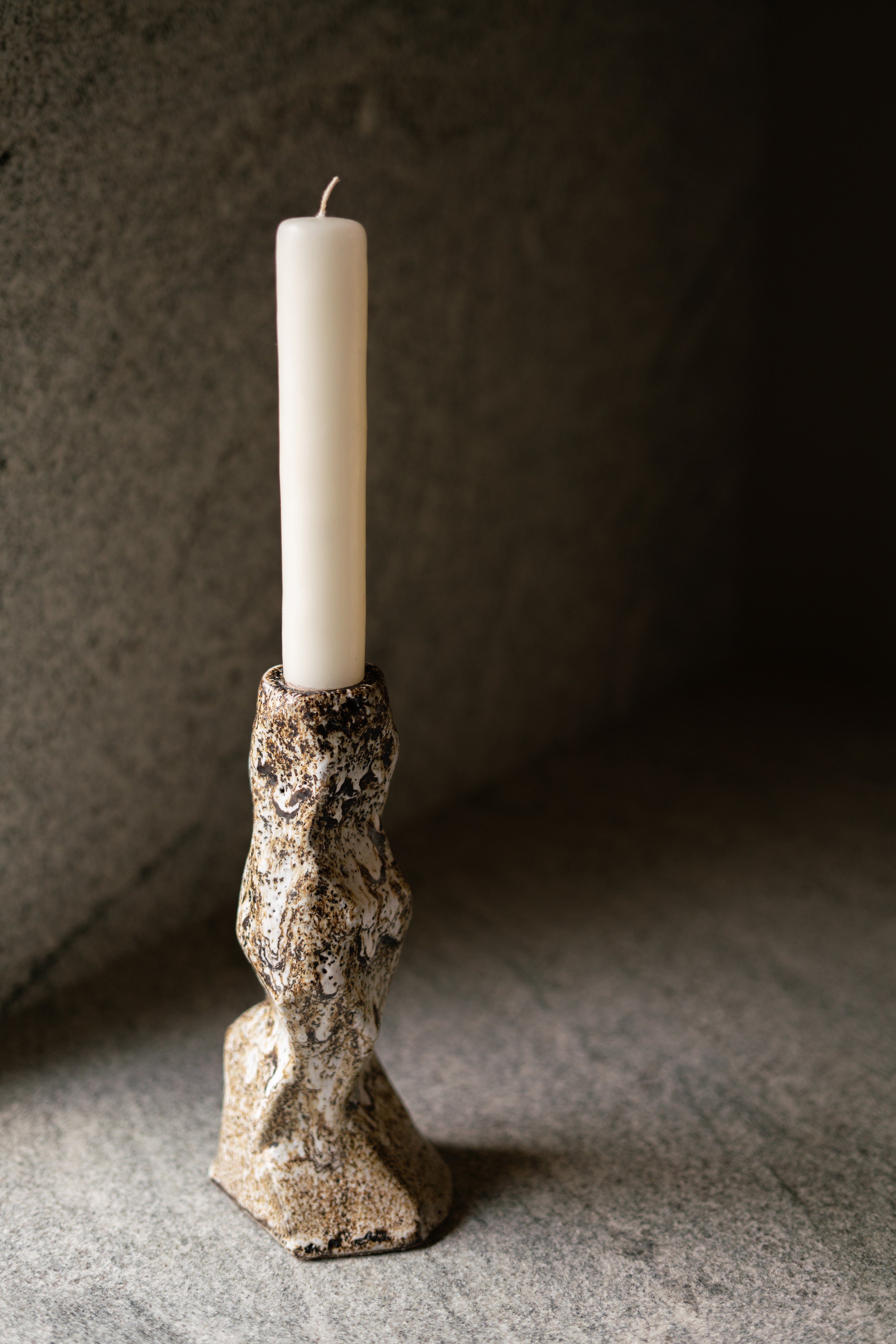 This Coyotl Candlestick by Lili Cortina is a one-of-a-kind, high-fired ceramic piece made with a melted iron glaze that pays homage to Earth and its ongoing transformation.