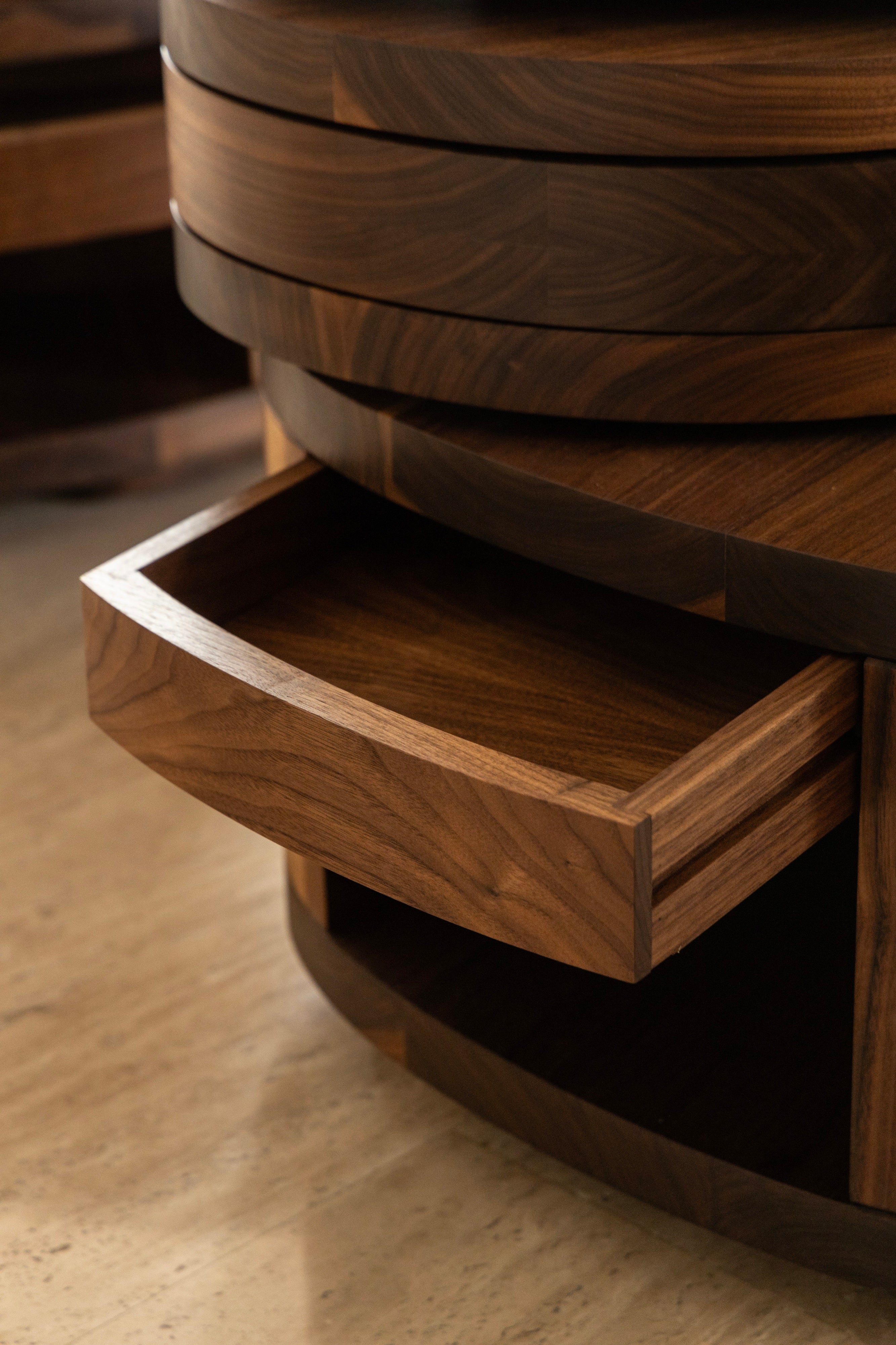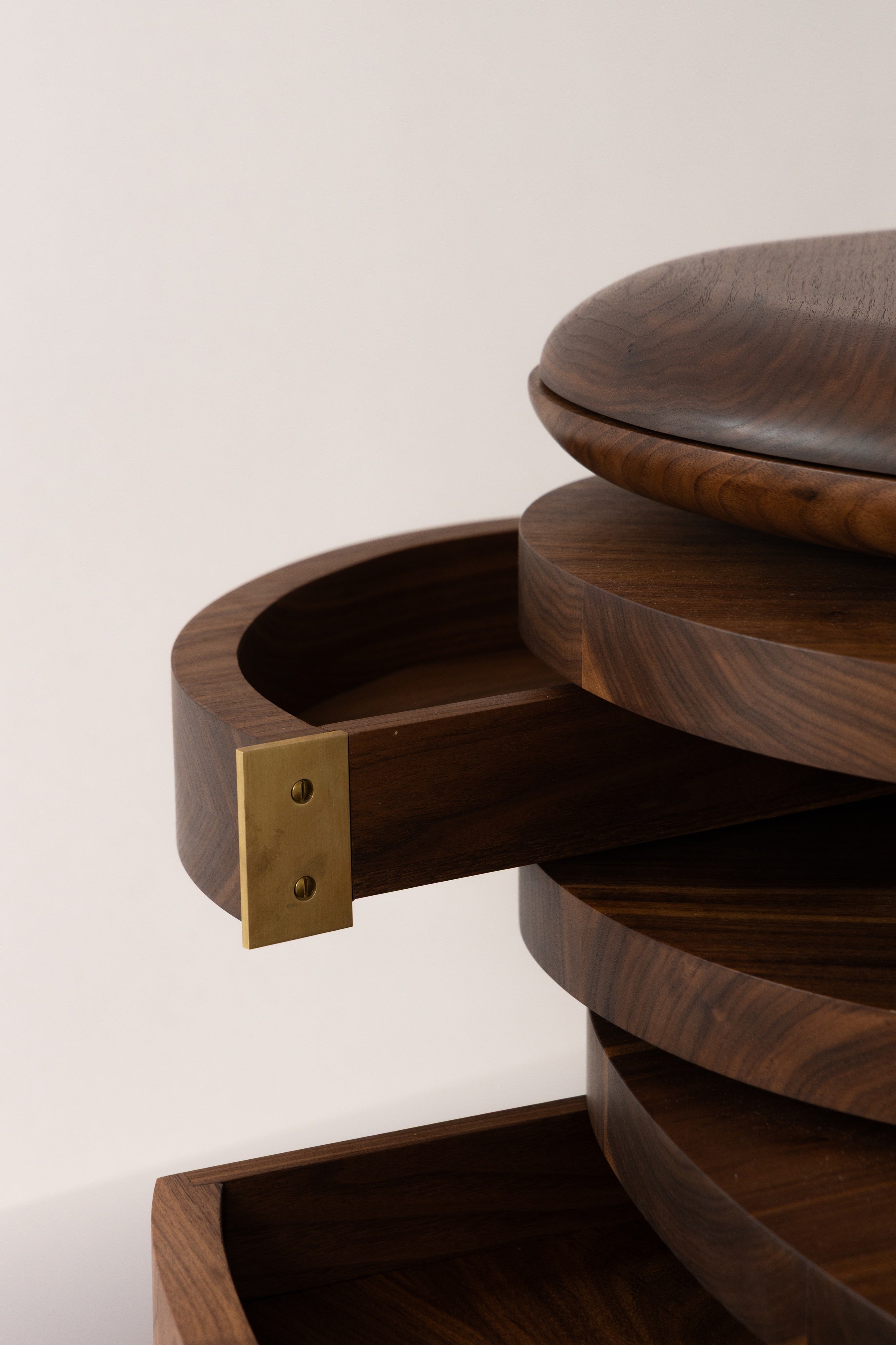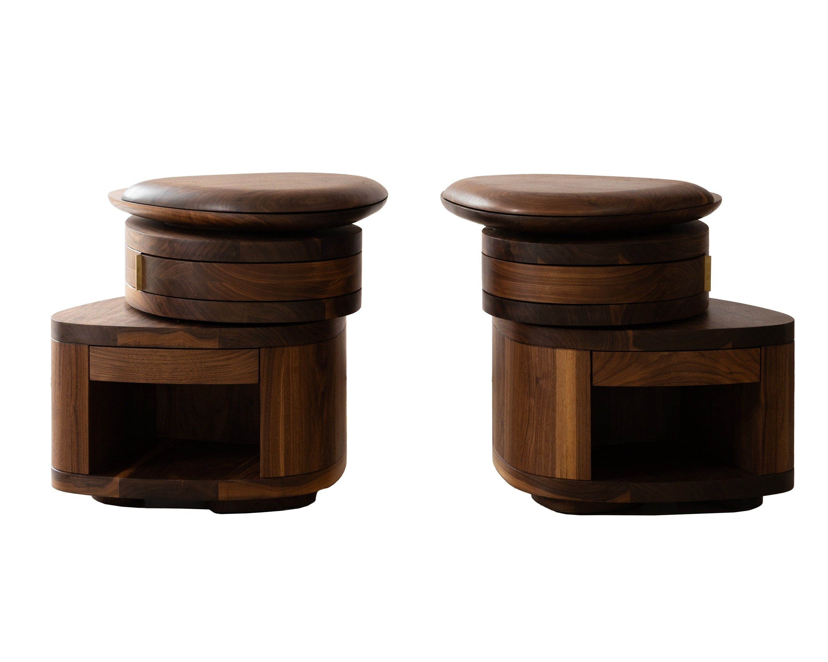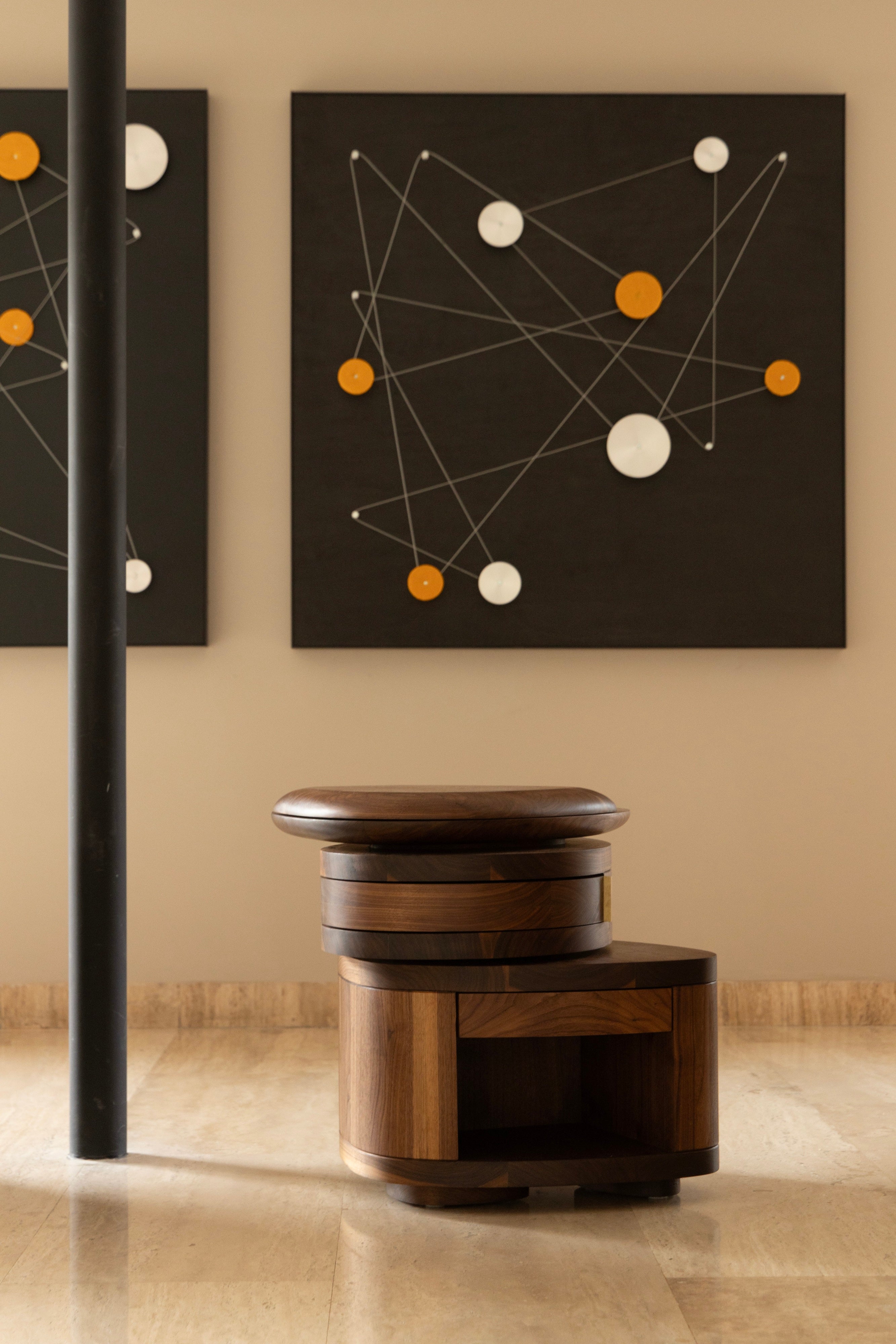 The piece incorporates a fold-out surface, a sliding drawer, an open niche/shelf, and a concealed drawer. This layered composition allows it to function simultaneously as a table, nightstand, and bench, expanding its possibilities within the domestic space.