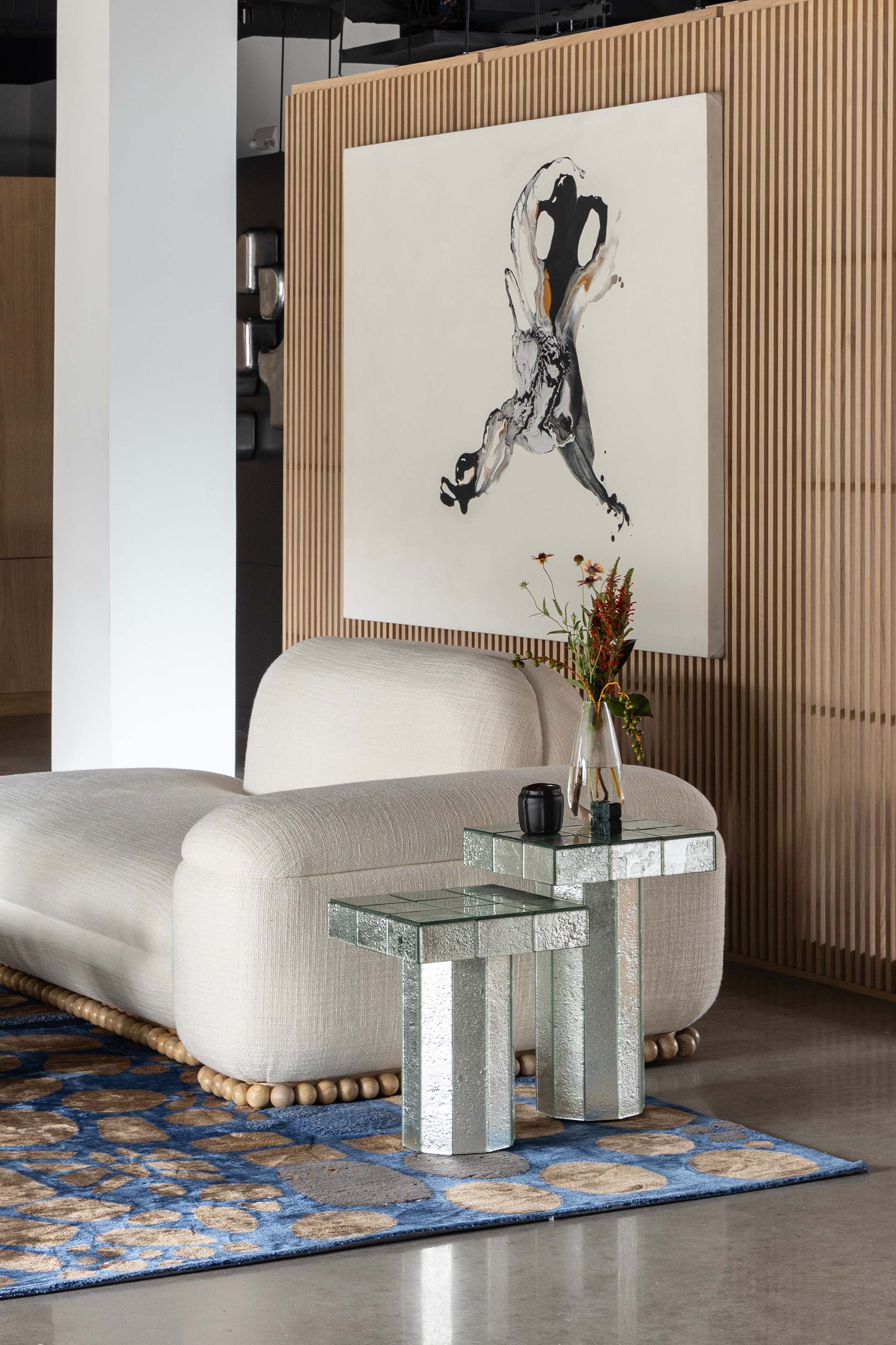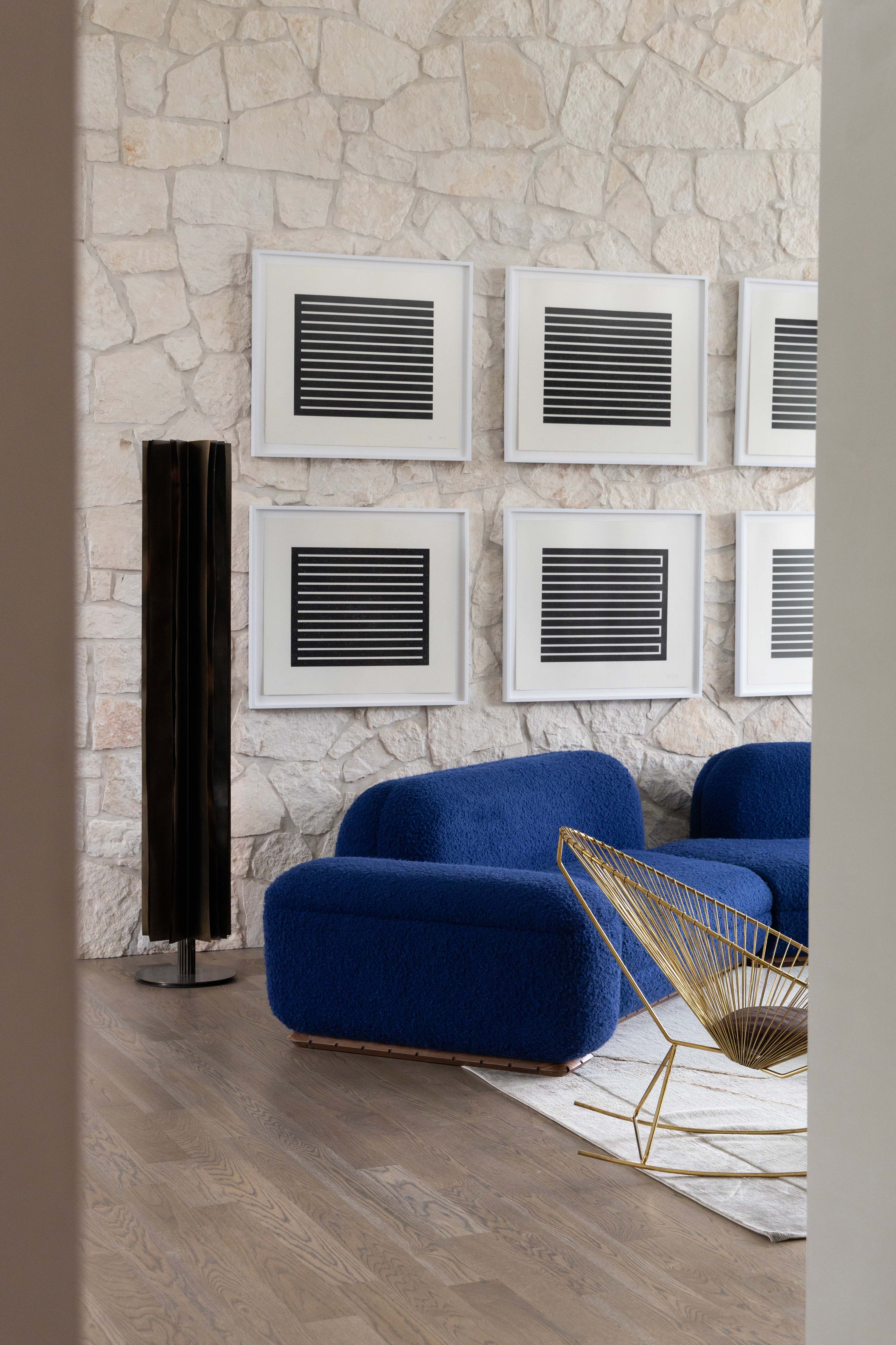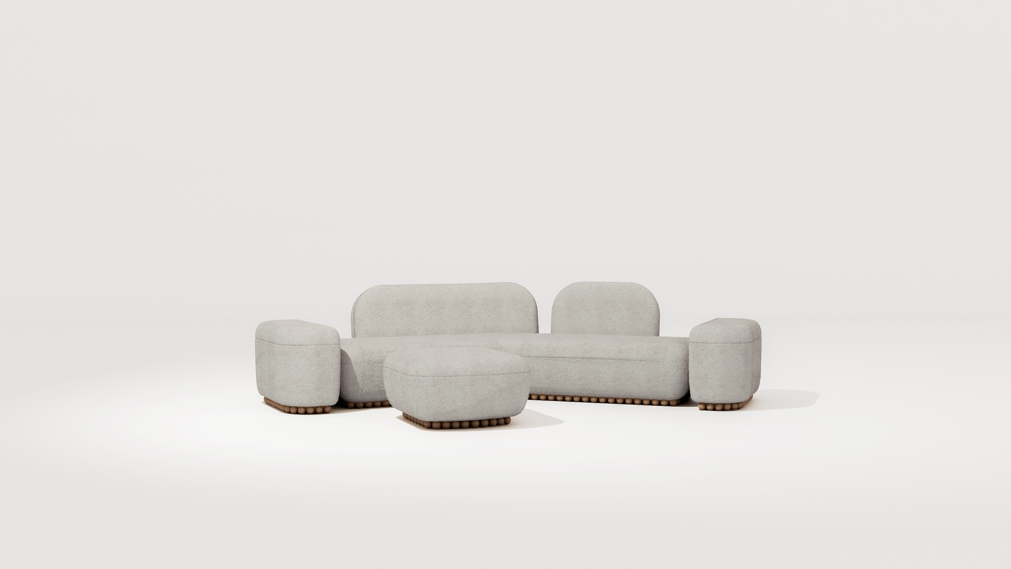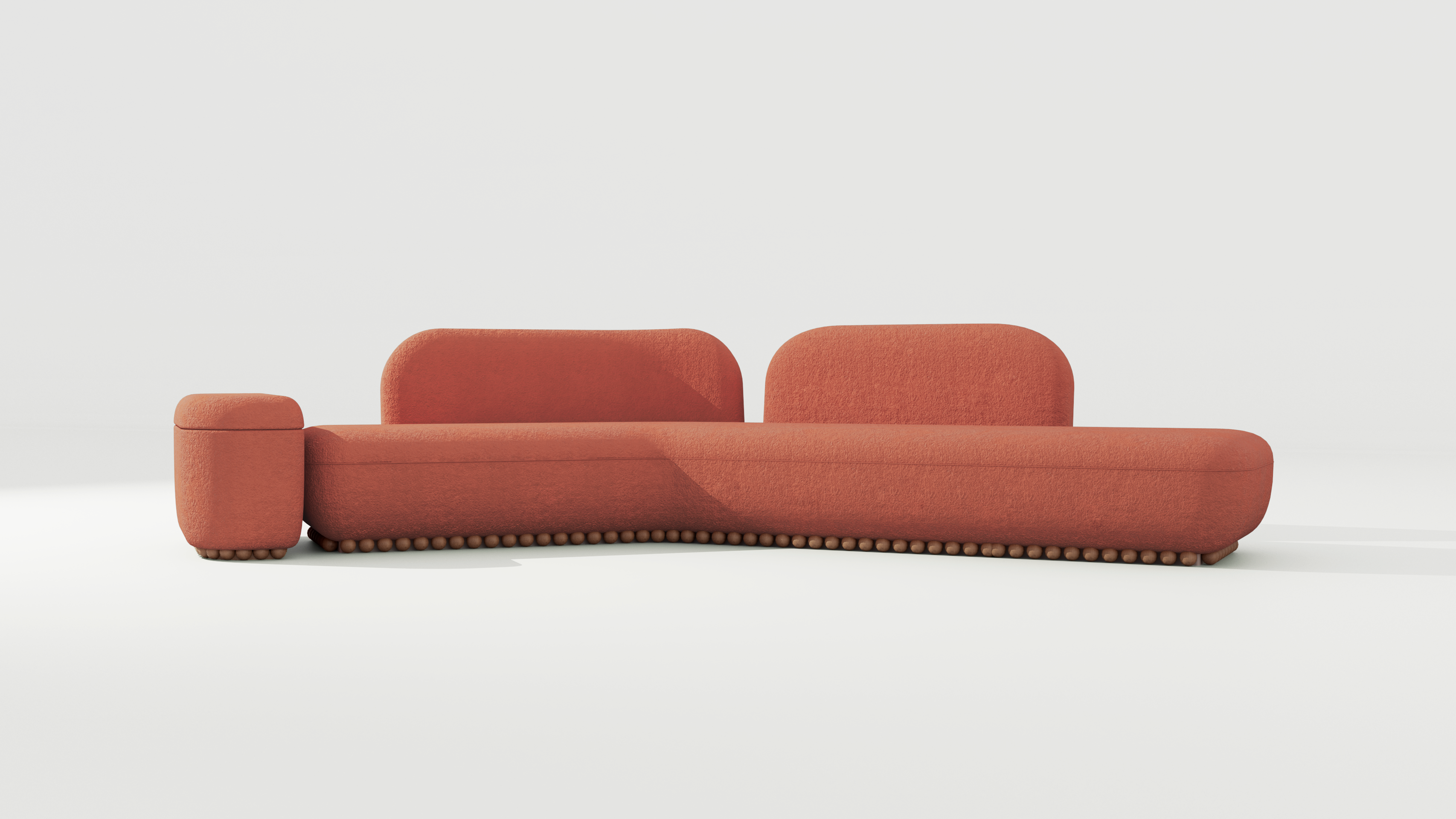 Inspired by the Mexican molinillo and wooden toy making, our Poncho Sofa reinterprets classic tradition by way of cotton bouclé upholstery and Rosa Morada hardwood details. The seat is deep and cozy, yet elegant in design. Can be customized with different bases, sizes, and fabrics. Contact us to learn more.