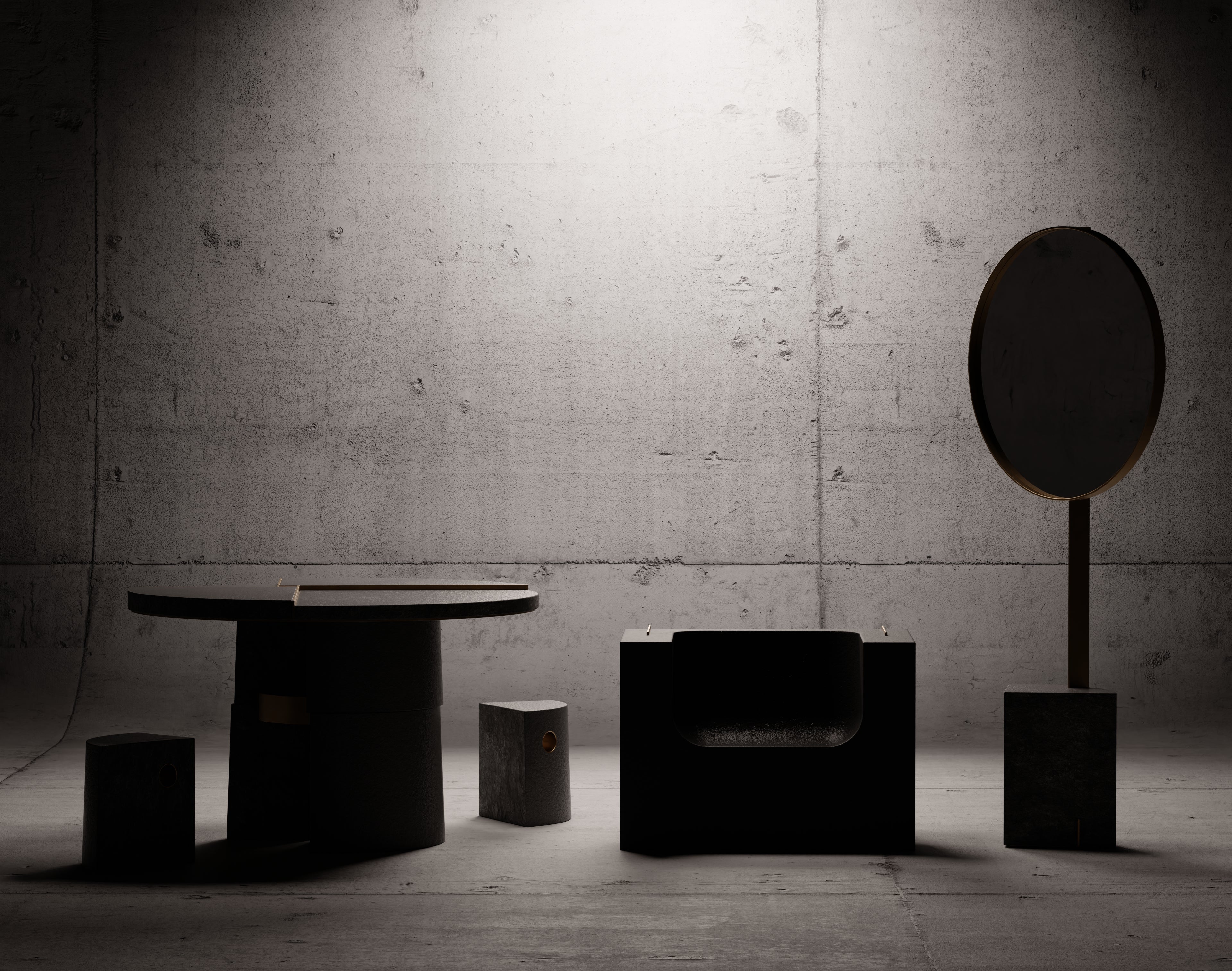 Multidisciplinary designer Daniel Germani explores a new pairing of materials through a brutalist lens in his new collection, AUREA. The table, stools and poltrona are devoid of any unnecessary design gestures, showcasing the beautiful imperfections and structural scale of lava stone in all its glory. The “raw boulders” comprising the pieces are softened and anchored by sleek brass details. The highly considered form, function, and ergonomics of AUREA create a sensory experience beyond what the eye can see.