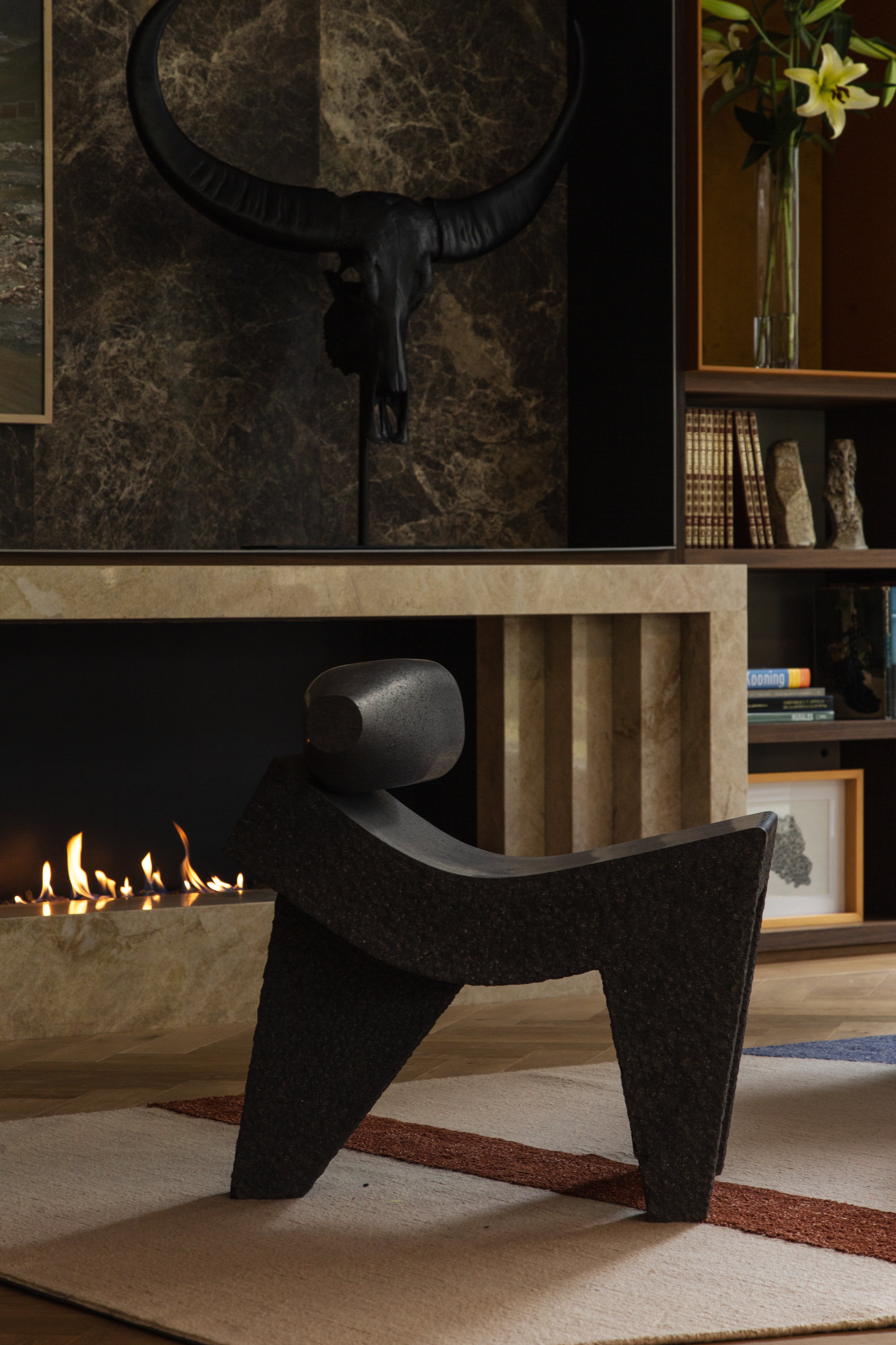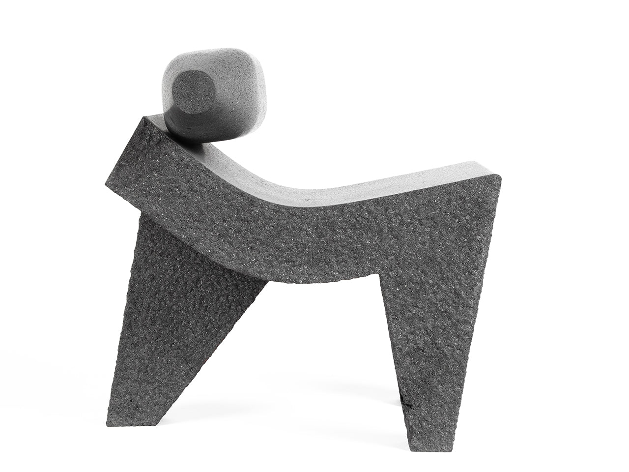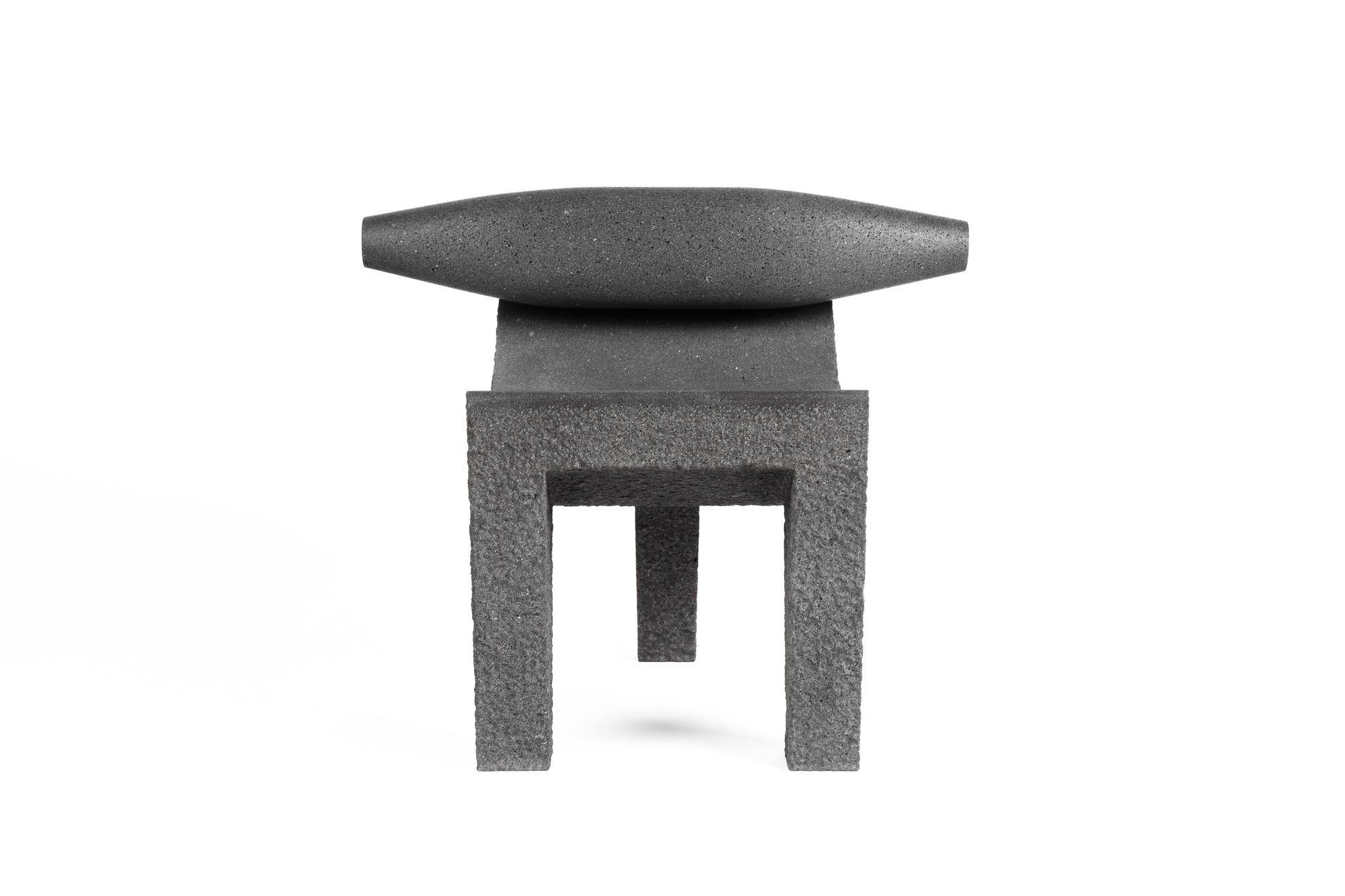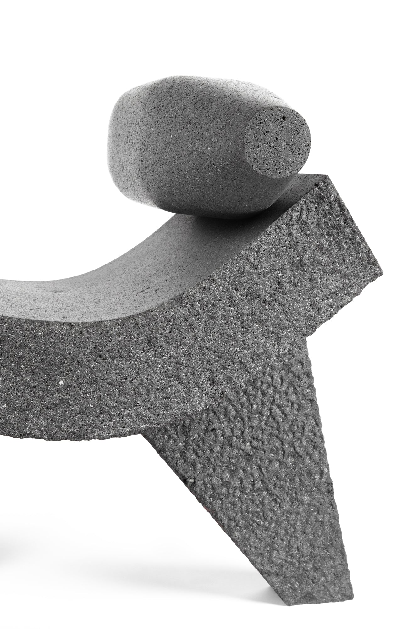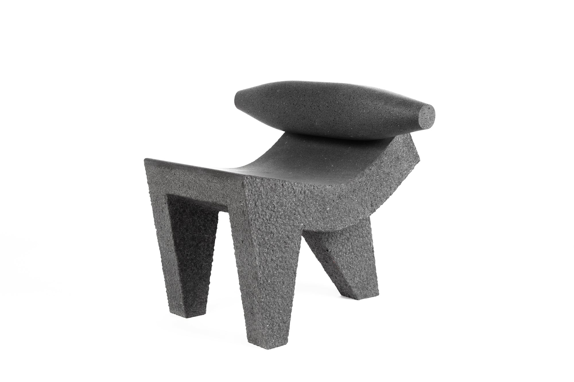 Being a mortar, the stability and firmness of the metate comes from its three legs that guarantee a firm seat on an uneven surface. That same geometry and weight have inspired this chair, whose curve functions as a backrest and a seat at the same time. Additionally, Metatl incorporates the metlapilli, also called temolote, used to grind the grains.